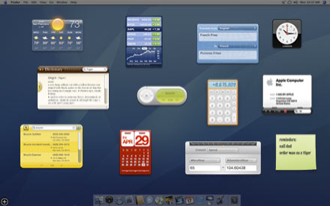 información al segundo El nuevo Dashboard alberga cómodas miniaplicaciones llamadas widgets que aparecen al instante y te mantienen al día de la información más útil de Internet. Consulta información sobre cotizaciones, predicciones metereológicas, vuelos de avión, conversión de divisas y unidades de medida, asi como negocios de las páginas amarillas. De forma parecida a Exposé, Dashboard salta a tu Escritorio simplemente con pulsar una tecla de función y muestra tus miniaplicaciones preferidas, cargadas de información actualizada, para luego desaparecer tan rápido como llegó de modo que puedas volver fácilmente a tus tareas. |